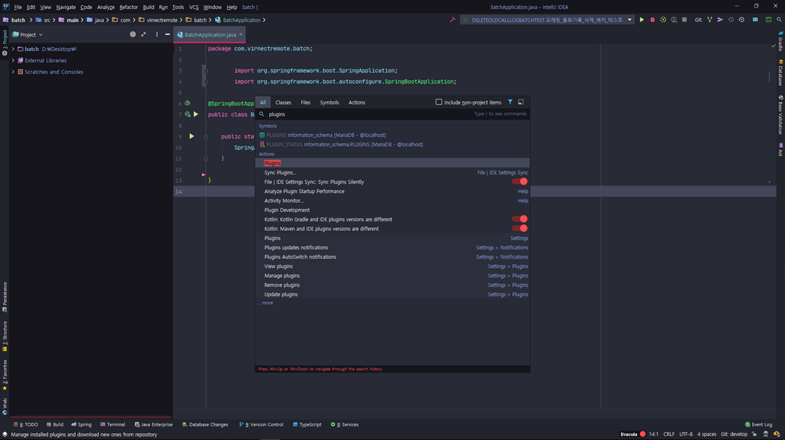 먼저 인텔리제이를 켜고, shift (window 기준)을 빠르게 두번 연타하여 검색창을 켜고, plugin 을 검색하면 action 목록에 플러그인을 설치할 수 있는 화면을 보여주는 항목이 나타난다.