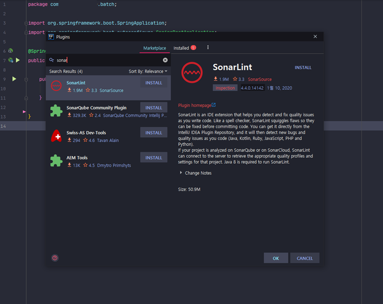 sonarLint는 오픈소스다. Intellij IDEA Ultimate(유로버전)의 경우 플로그인 기능을 사용할 수 있고, 마켓플레이스에 SonarLInt가 올라와 있어 간단하게 설치하는것으로 Intellij와 연동이 끝난다.
