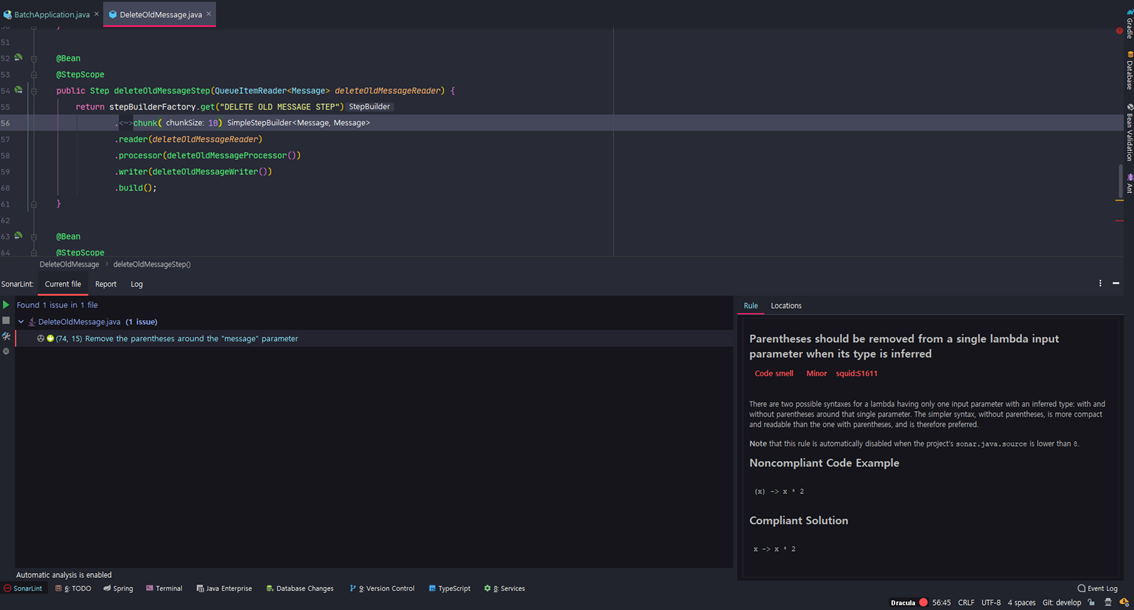 내용을 해석하자면, 람다 표현식 중에, 인자가 하나인경우 () 괄호를 지워줘야한다는 규칙에 위배되었다는 뜻이다.