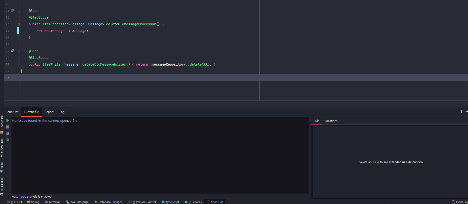 코드를 수정하고 IDE 하단에 있는 SonarLint 탭을 보면 다음과 같이 경고가 사라진것을 확인할 수 있다.