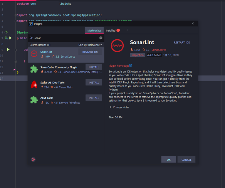 Install 버튼을 클릭하여, 설치를 하면 다음과 같이 설치 버튼이 RESTART IDE 라는 문구로 바뀐다. 설치된 플러그인을 적용하기 위해 IDE를 재시작하라는 의미이다. 재시작을 하자.