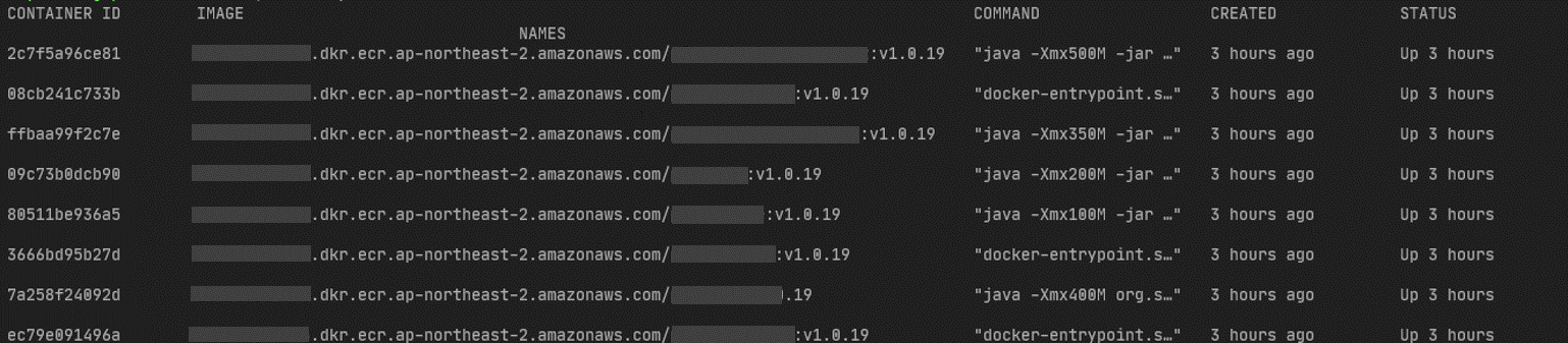 {ID}. dkr.ecr.us-east-2.amazonaws.com/{리파지토리명}:{tag} 형태로 ECR에서는 도커 이미지를 관리하는데, EC2에서 이미지를 받아서 컨테이너를 돌렸을 때, 도커 컨테이너 리스트를 확인하면 다음 사진과 같이 뜨게 된다.