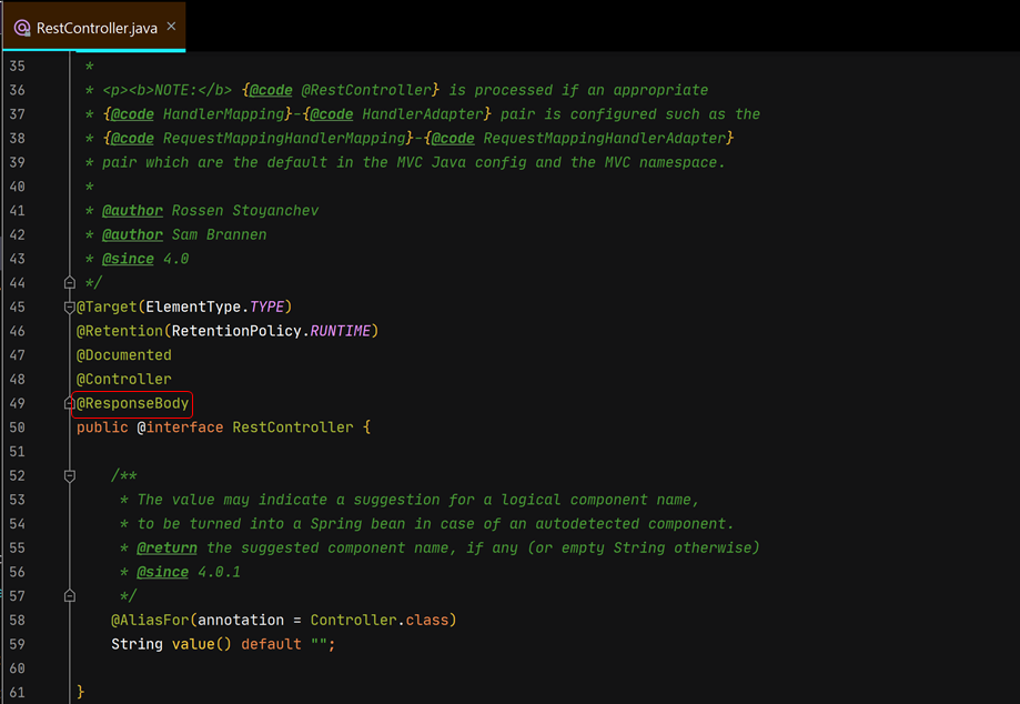 먼저 @RestController 어노테이션이 선언된 Controller 클래스의 경우 @RestController 어노테이션 안에 있는 @ReponseBody 어노테이션에 의해 응답 데이터가 view로 반환되지 않고, MessageConverter 클래스로 인해 JSON 데이터로 변환되고 HTTP Response Body에 직접 작성된다.
