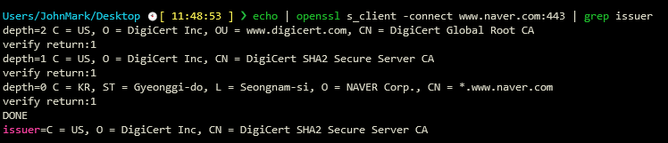 두 번째로, 해당 인증서는 누가 발급했는지 CA 정보가 궁금했다. 이런 경우 issuer 정보를 확인하면 된다.