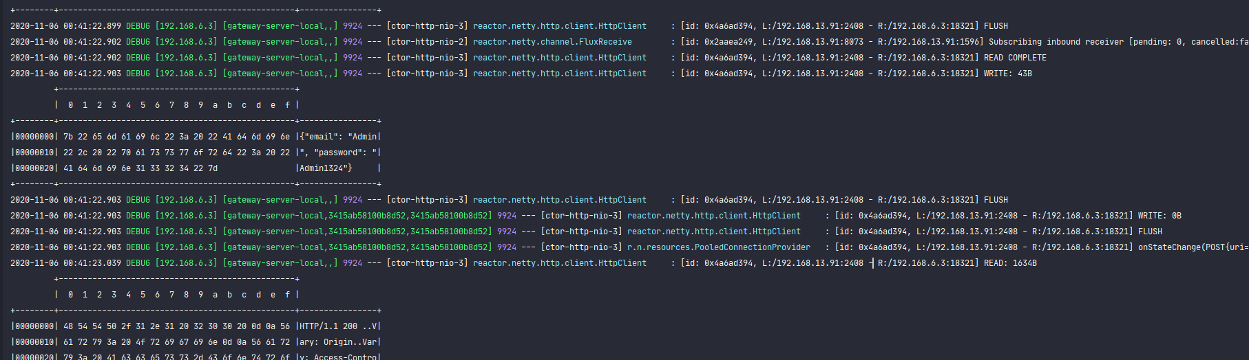 이후 Gateway Server를 실행 시키고 리퀘스트를 보내게 되면 여러 debug 로그 중에 다음과 같이 proxy 전에 gateway server 가 받은 데이터의 내용과 시간대 그리고 proxy 하여 받은 응답의 시간대와 데이터를 확인할 수 있고, 이를 바탕으로 Gateway 서버와 다운 스트림 서버 간의 지연 시간도 유추할 수 있다.