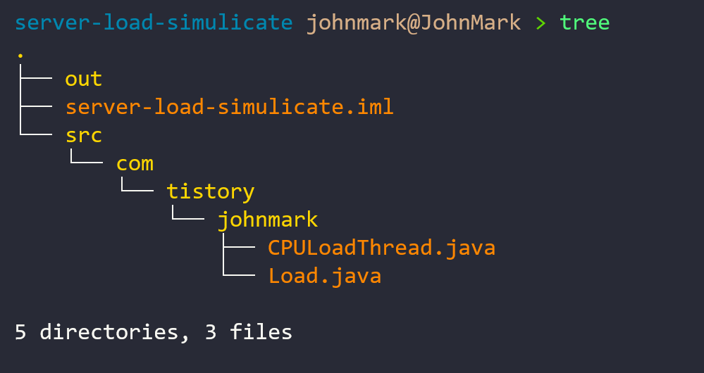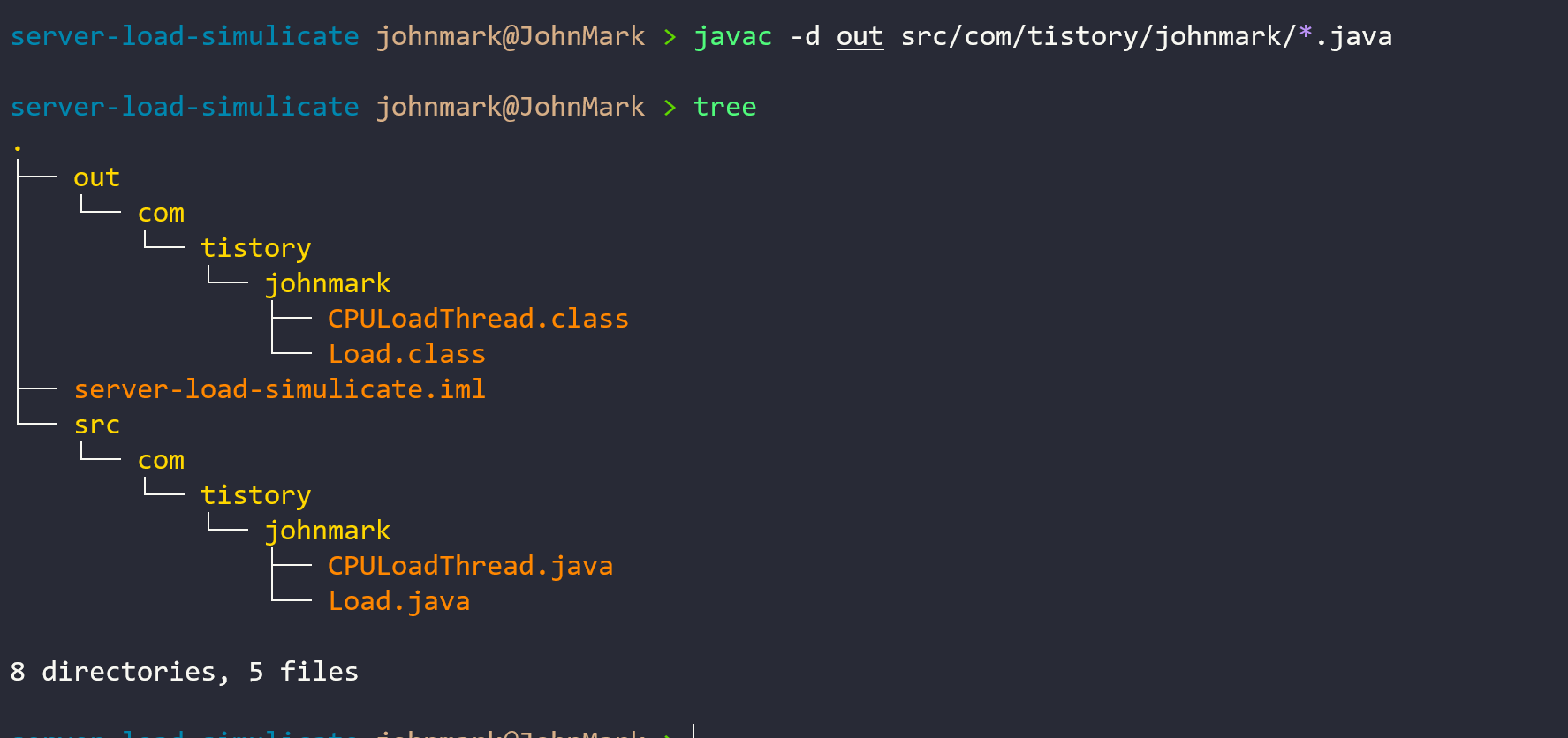 javac는 Java Compiler 프로그램으로 -d 옵션으로 컴파일의 결과물인 class 파일이 위치할 경로와 java 파일들을 파라미터로 받는다. 난 현재 프로젝트의 out 디렉토리 하위에 class 파일들이 위치하도록 하였고, 대상 java 파일은 src/com/tistory/johnmark/ 디렉토리 하위의 모든 자바 파일을 대상으로 하였다. 참고로 javac -d 옵션에 사용되는 디렉토리는 미리 만들어져있어야 한다. javac에서는 디렉토리를 만들지 않는다. 이에 tree 명령어로 다시 프로젝트 구조를 살펴보면 out 디렉토리 하위에 class 파일을 이 java 파일들과 매칭 되어 만들어져 있는 것을 확인할 수 있다.