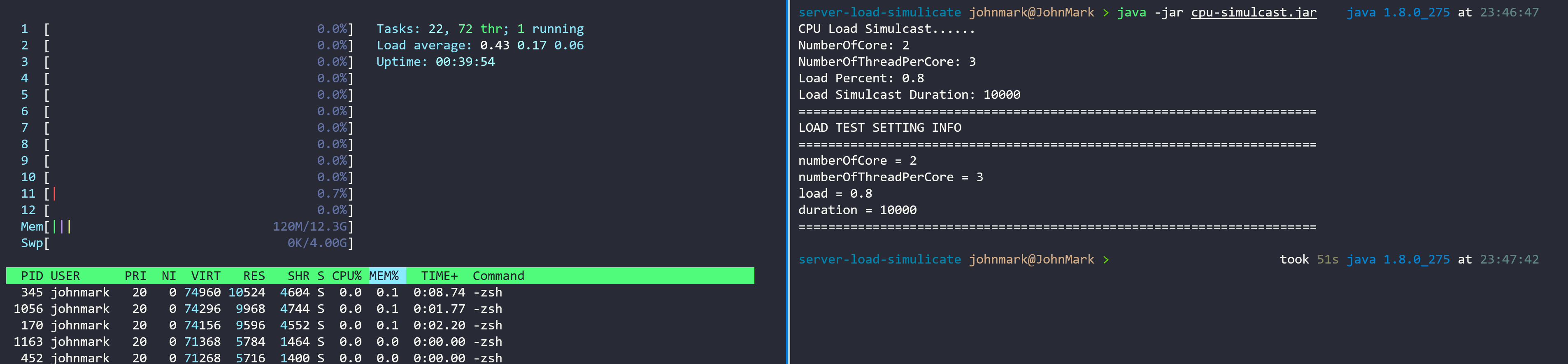 CPU Load Simulcast 하는데 있어서 사용할 CPU 코어의 개수, 코어당 사용할 스레드의 개수, 로드율, 부하 시간 등을 입력받으면, 코어당 스레드 개수만큼의 스레드를 생성하여 CPU 점유율을 높이는 간단한 프로그램이다.