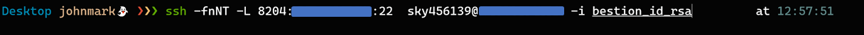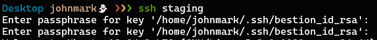 해당 명령어를 실행하면, 베스천 서버로 연결한 뒤에 다시 private subnet에 위치한 서버로 proxy된다. 나 같은 경우 접속 인증 키파일에 passphrase가 설정되어있어서 베스천 한번, 타겟 서버 한번 이렇게 총 두 번 비밀번호를 입력을 해야 한다.