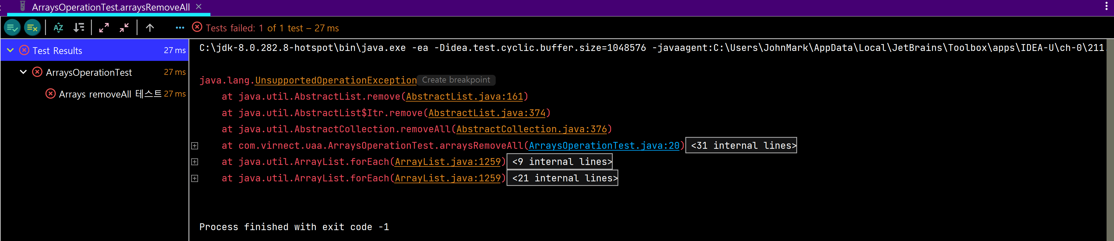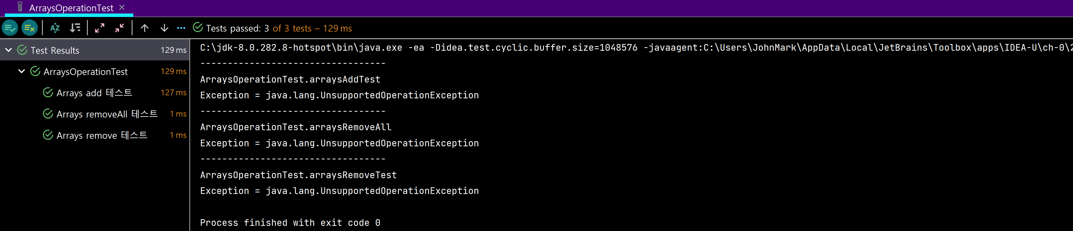 그랬더니, UnsupportedOperationException 예외가 발생했다. 한마디로 해당 연산은 지원하지 않는다는 에러이다.