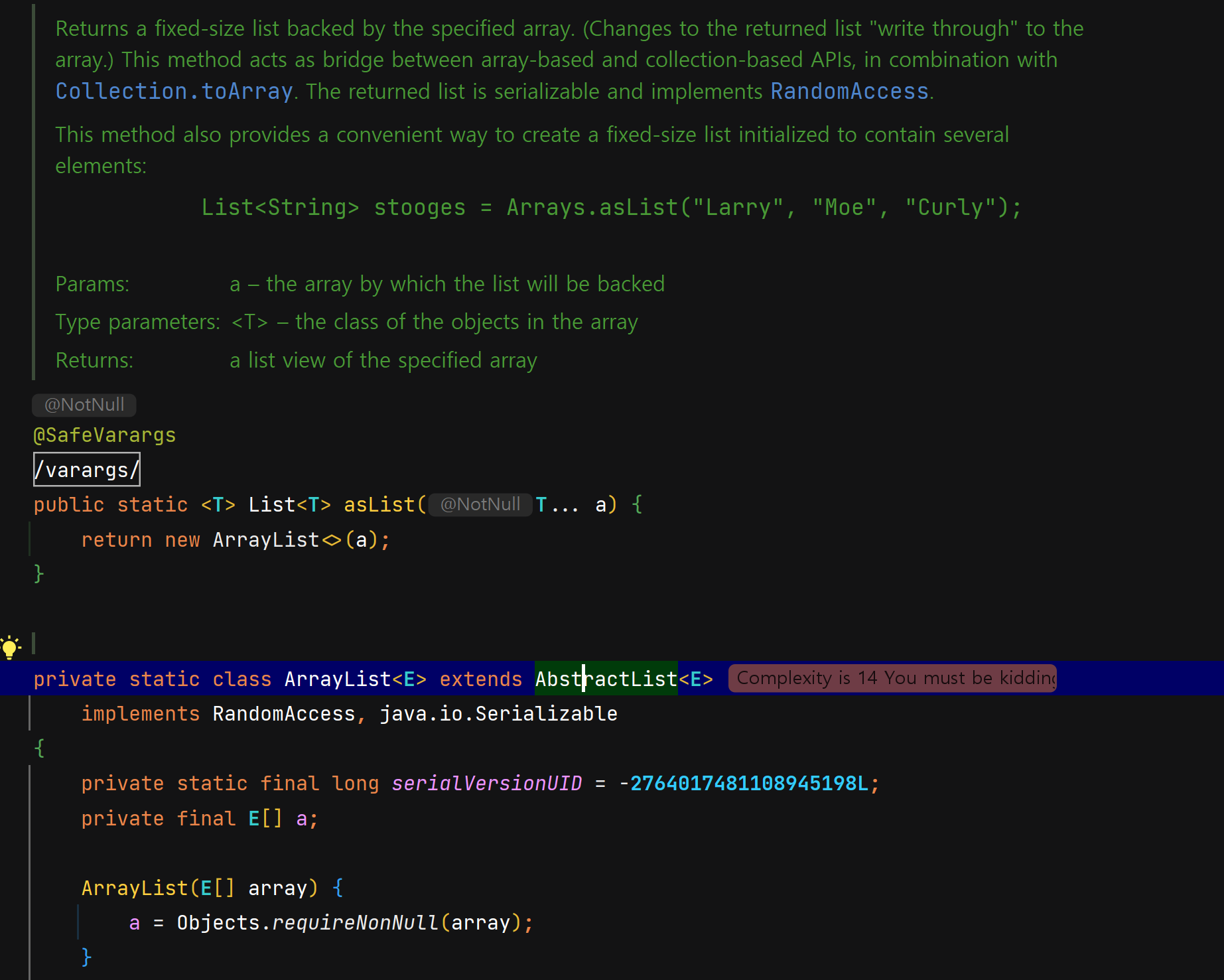 이 부분을 보고 약간 충격을 받았다. 리턴 타입 클래스명이 ArrayList이고, List 타입 변수에 할당이 잘 되기에 평소에 하는 java.util 패키지에 있는 ArrayList 클래스를 리턴할 줄 알았는데, Arrays 클래스의 inner class인 ArrayList를 리턴하는 것이었다.