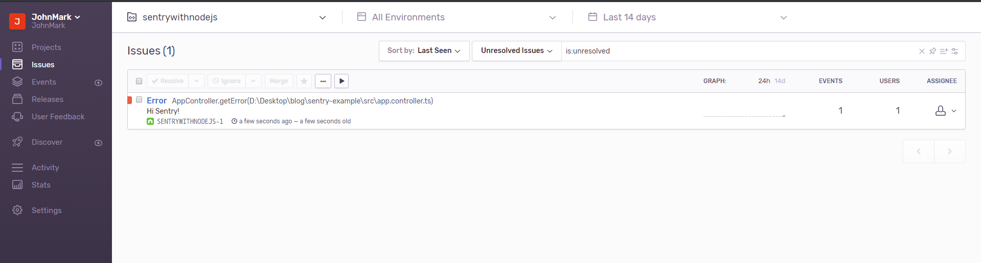 자 그러면 error를 발생시키는 http://localhost:3000/error로 요청을 다시 날려보자! 해당 요청이 들어오면 서버는 예외를 발생시키고, Sentry의 Raven 모듈이 관련 정보를 Sentry로 보낼 것이다!