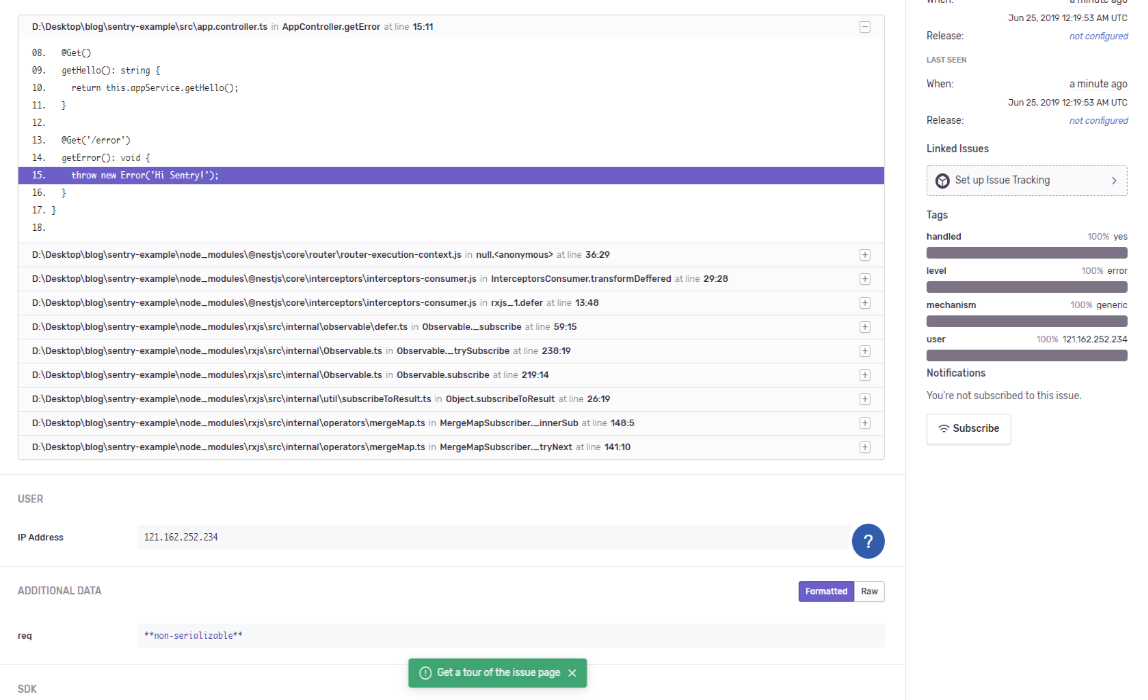 에러가 발생한 코드의 위치와 관련 stacktrace의 정보 (항목을 누르면 더 자세한 내용이 표시된다.)와 에러 발생시간, IP 등 다양한 정보가 표시되며, 해당 이슈에 대한 태그와 또한 팀원에게 assign 할 것인지도 정할 수 있다.