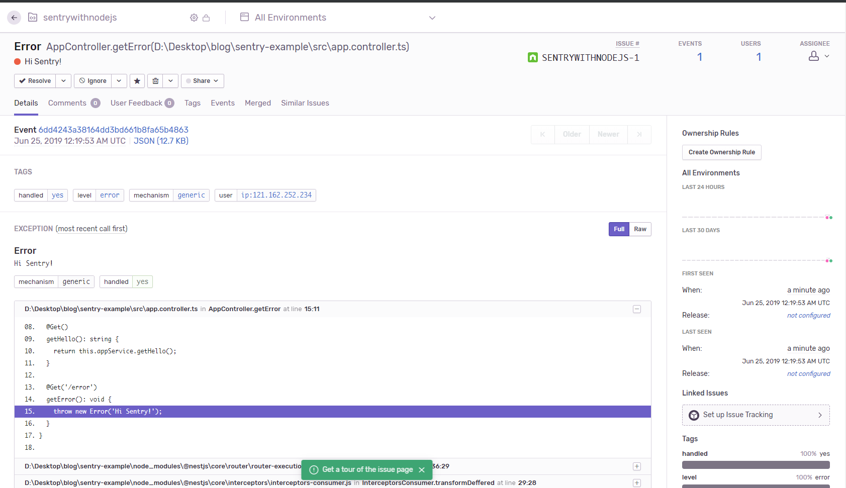 서버에서도 Hi Sentry!라는 에러 메시지와 stacktrace 정보가 잘 로깅되었다! 그렇다면 Sentry 프로젝트에 접속하여 로깅 결과를 살펴보자!