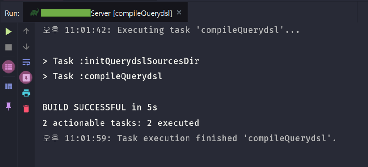 Gradle에서 compileQuerydsl Task 실행시키면, 아래와 같이 콘솔 로그가 찍히게 됩니다. Build Successful이라는 문구가 뜨면 각 Entity 클래스에 맞는 QClass가 앞서 build.gradle 스크립트에서 정의한 querydslSrcDir 위치에 성공적으로 생성됩니다.