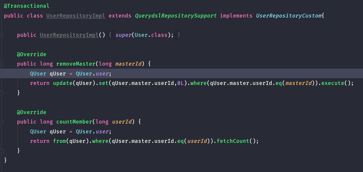 이후 다음과 같이 CustomRepository Interface를 만들고, 해당 Interface를 구현하는 CustomRepositoryImpl 클래스에 QuerydslRepositorySupport 클래스를 상속받아 원하는 비즈니스 로직에 맞춰 메소드를 호출합니다.