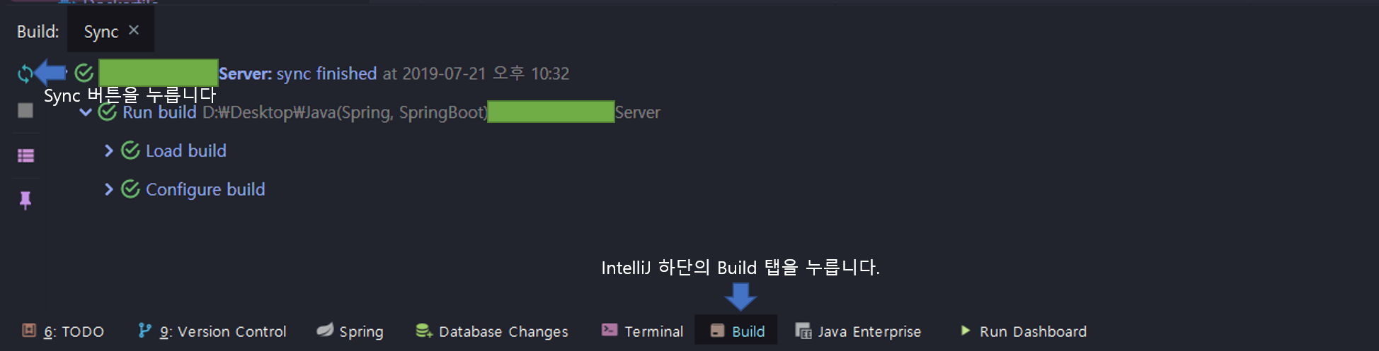 Build관련 프로세스가 모두 녹색으로 체크가 완료되고, Sync finished 문구가 뜨면 Gradle이 Querydsl 관련 라이브러리와 Task 관련 스크립트를 성공적으로 적용한것입니다.