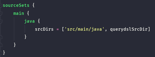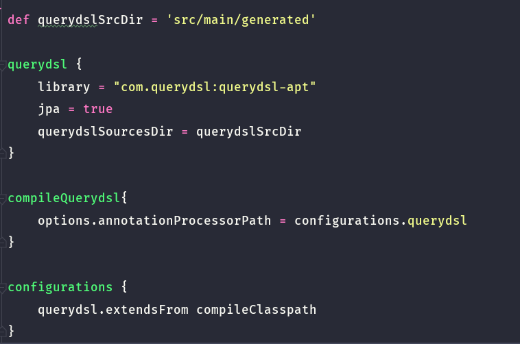 이후, gradle에서 querydsl을 통해 Qclass를 생성하기 위하여 QClass가 생성될 디렉토리의 위치와 관련 설정들을 작성하는 Task를 다음과 같이 추가해줍니다.