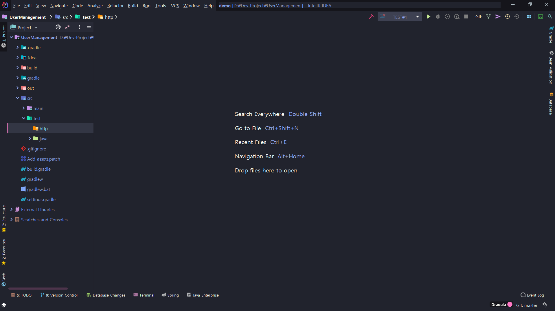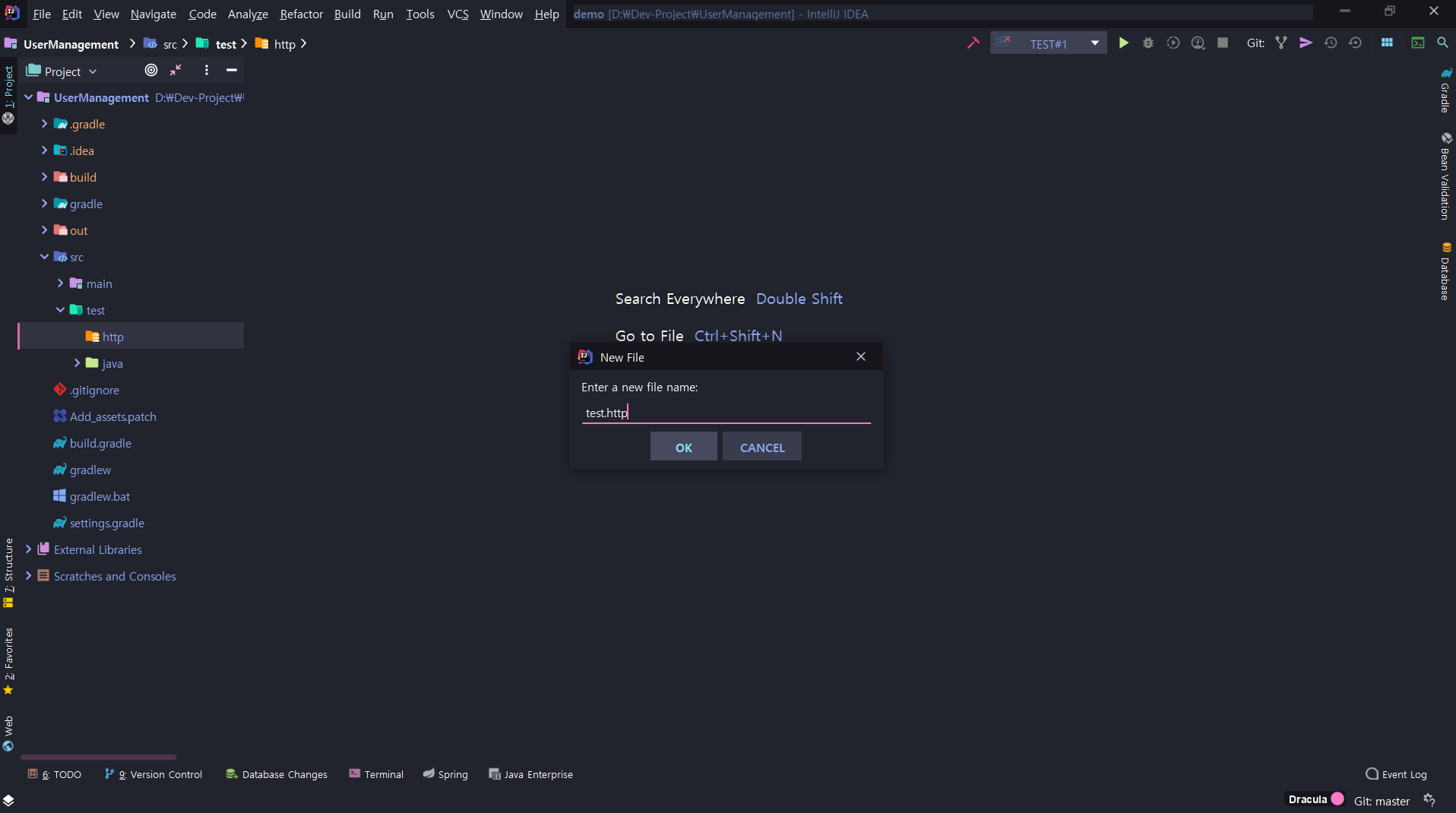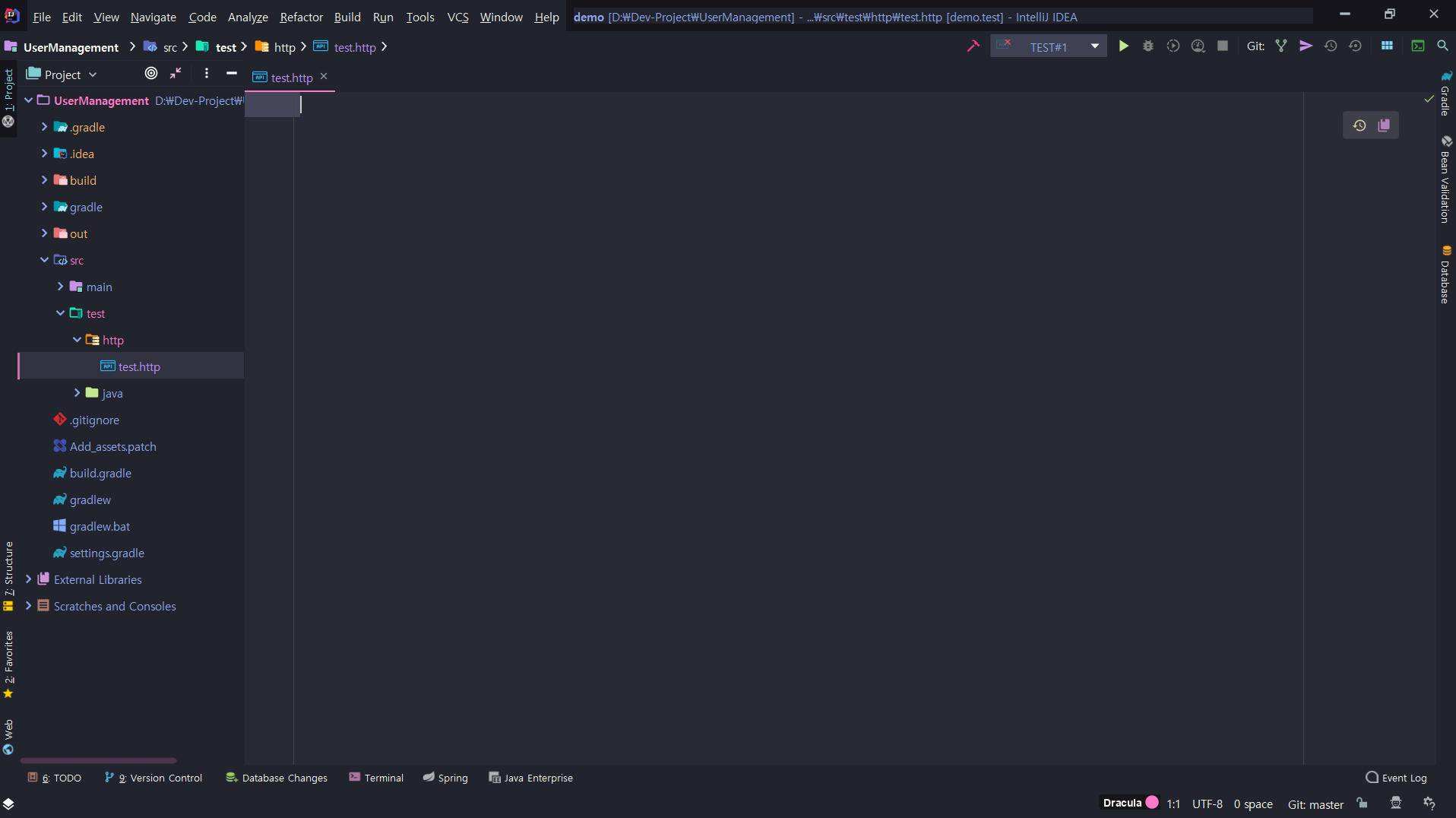 이후 http 디렉토리 안에 테스트를 하기 위한 .http 파일을 생성해줍니다. Intellij는 .http로 끝나는 파일을 Http Client를 사용하기 위한 파일인 것으로 인식합니다.