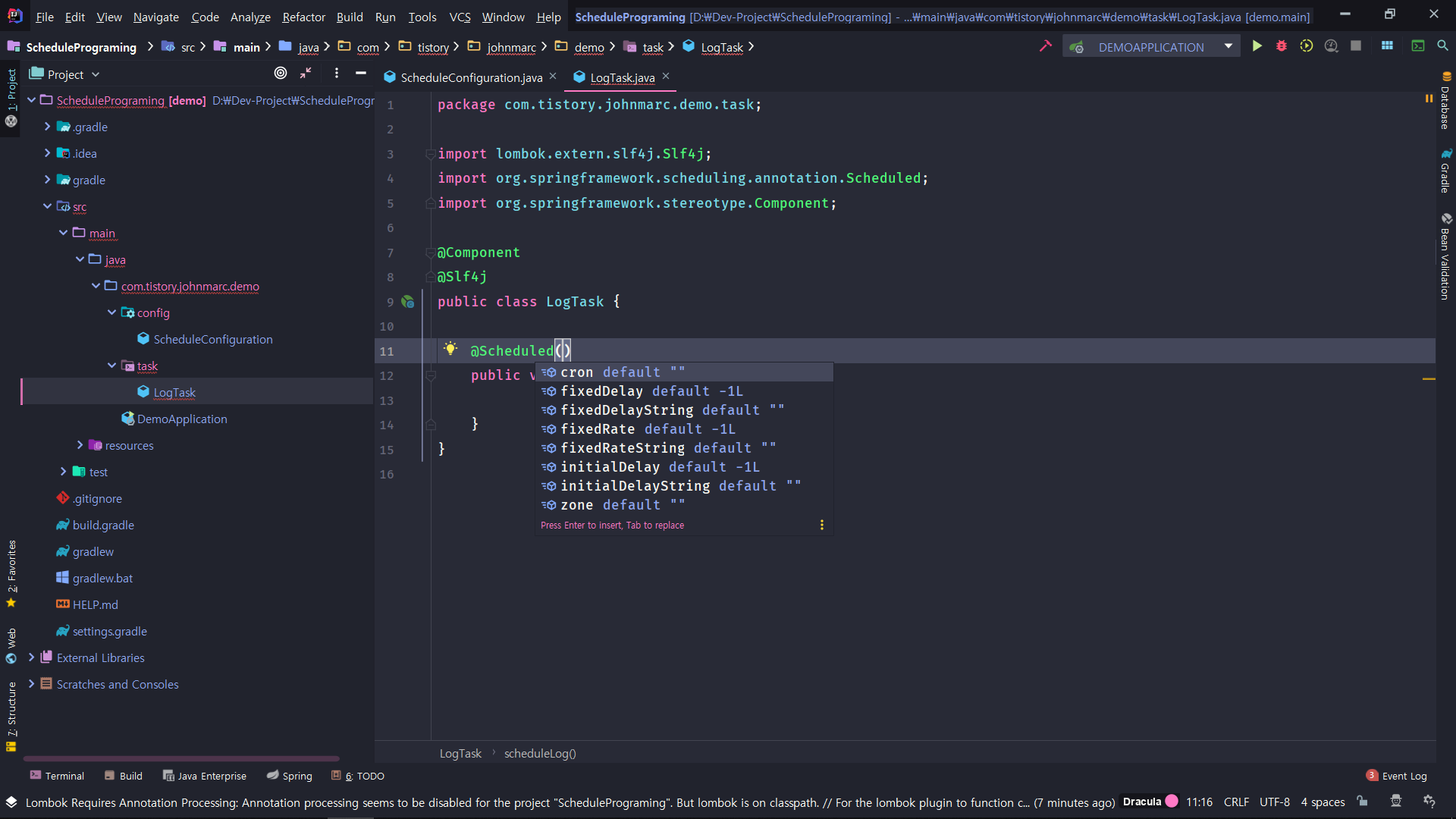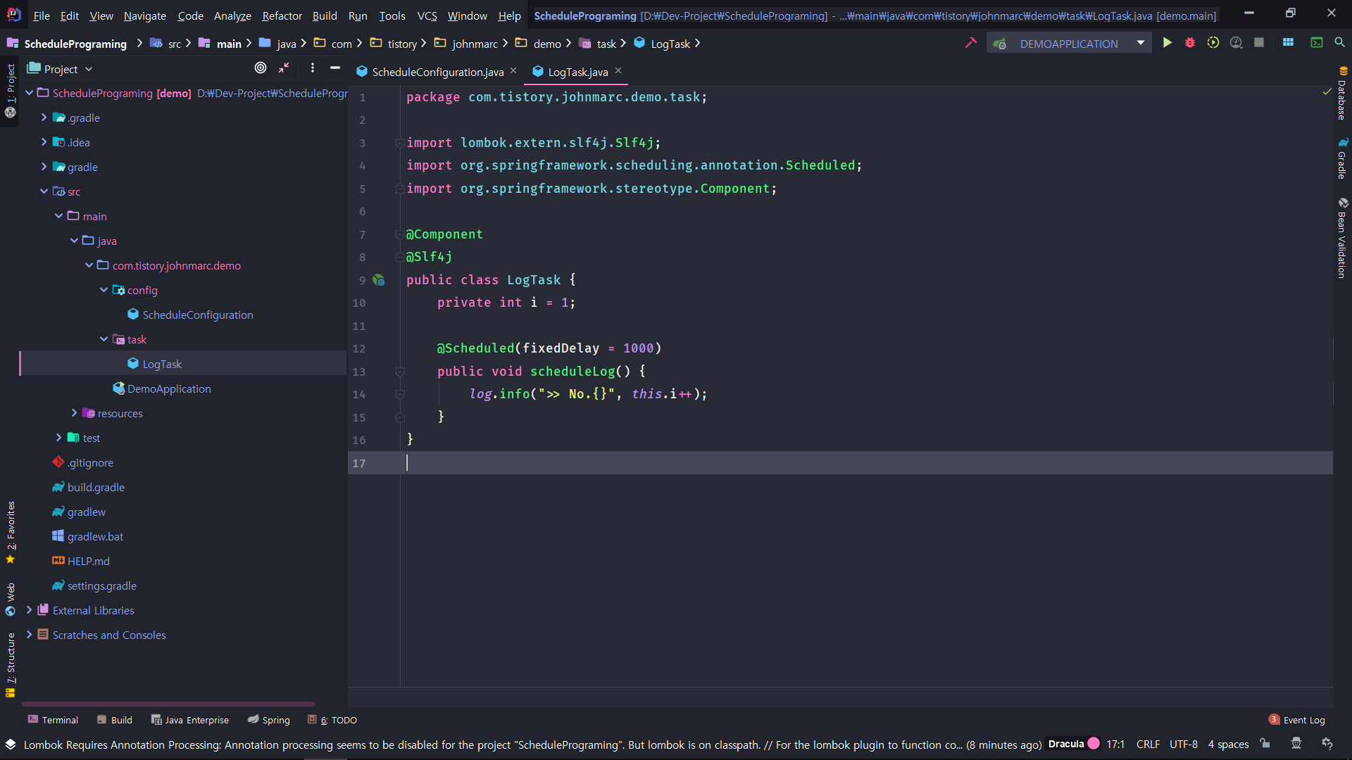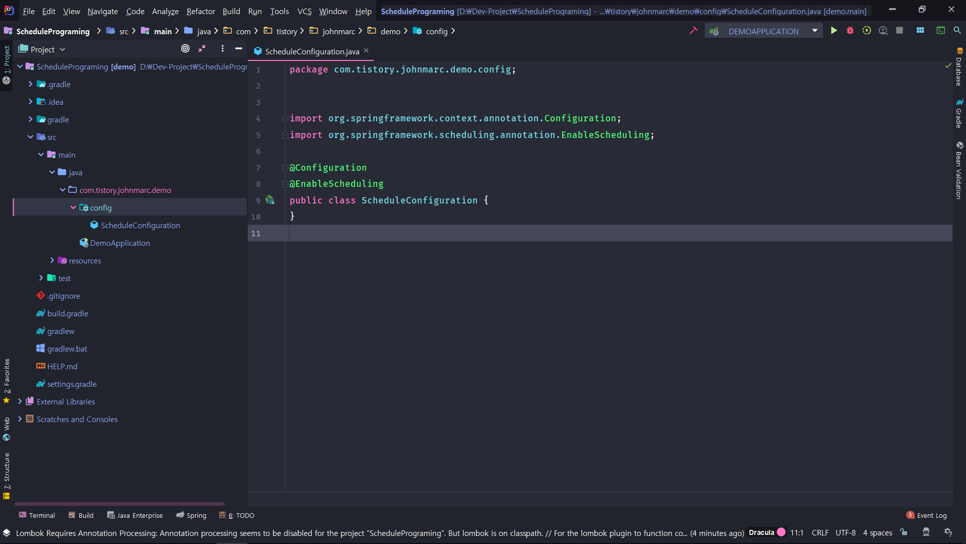 프로젝트의 메인 클래스인 DemoApplication 클래스에서 @EnableScheduling 어노테이션을 선언하여, 스케줄링 기능을 활성화할 수 있지만, 나는 설정 파일들은 모두 따로 config 패키지 하위에 클래스로 생성하여 관리한다. 이 방법이 좀 더 직관적인 것 같다.