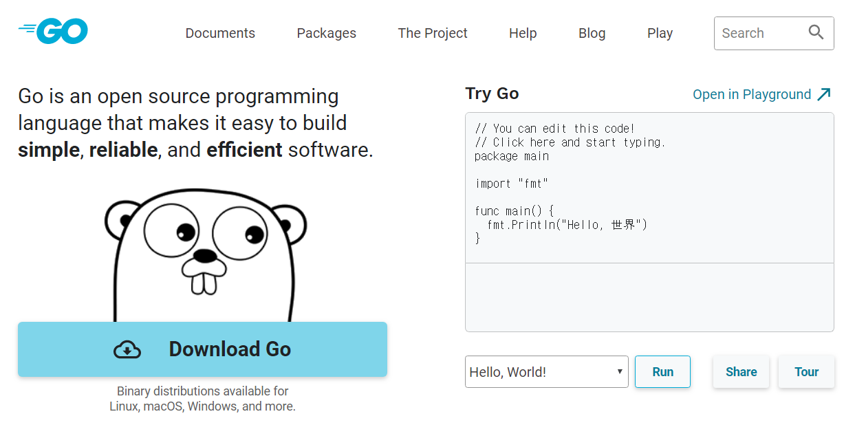 Download Go Binary distributions available for Linux, macOS, Windows, and more. // You can edit this code! // Click here and start typing. package main import "fmt" func main() { fmt.Println("Hello, 世界") } Hello, World! Conway's Game of Life Fibonacci Clos