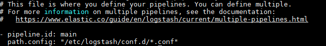 대략 설정 파일에 대한 내용은 위와 같다. 그럼 Logstash가 작업하는 내용을 담은 pipelines.yml 파일을 한번 살펴본다.